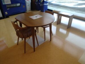 マナー悪化のため一時的に撤去していた飲食スペースについて、1階自動販売機前に再度設置いたしました。